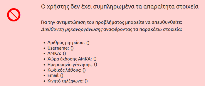 Αν έχετε το παρακάτω πρόβλημα, δηλαδή δεν έχει εντοπιστεί χρήστης με τα προσωπικά σας στοιχεία, τότε επικοινωνήστε με τη γραμματεία σας και αναφέρετε ότι από το τμήμα υποστήριξης σας έχουν ενημερώσει ότι λείπει το GUnet ID και πρέπει να συμπληρωθεί από τη γραμματεία. ΣΗΜΑΝΤΙΚΟ για τους πρωτοετείς φοιτητές: Η συνολική διαδικασία που πρέπει να ακολουθήσετε είναι διαθέσιμη εδώ.