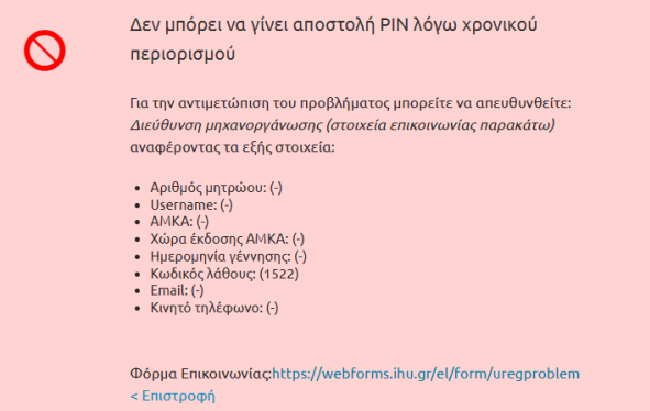 Στην περίπτωση που σας εμφανίζεται μήνυμα χρονικού περιορισμού για το PIN, το πρόβλημα λύνεται μόνο του μετά από 15 λεπτά. ΠΡΟΣΠΑΘΗΣΤΕ ΕΚ ΝΕΟΥ ΜΕΤΑ ΑΠΟ 15 ΛΕΠΤΑ.